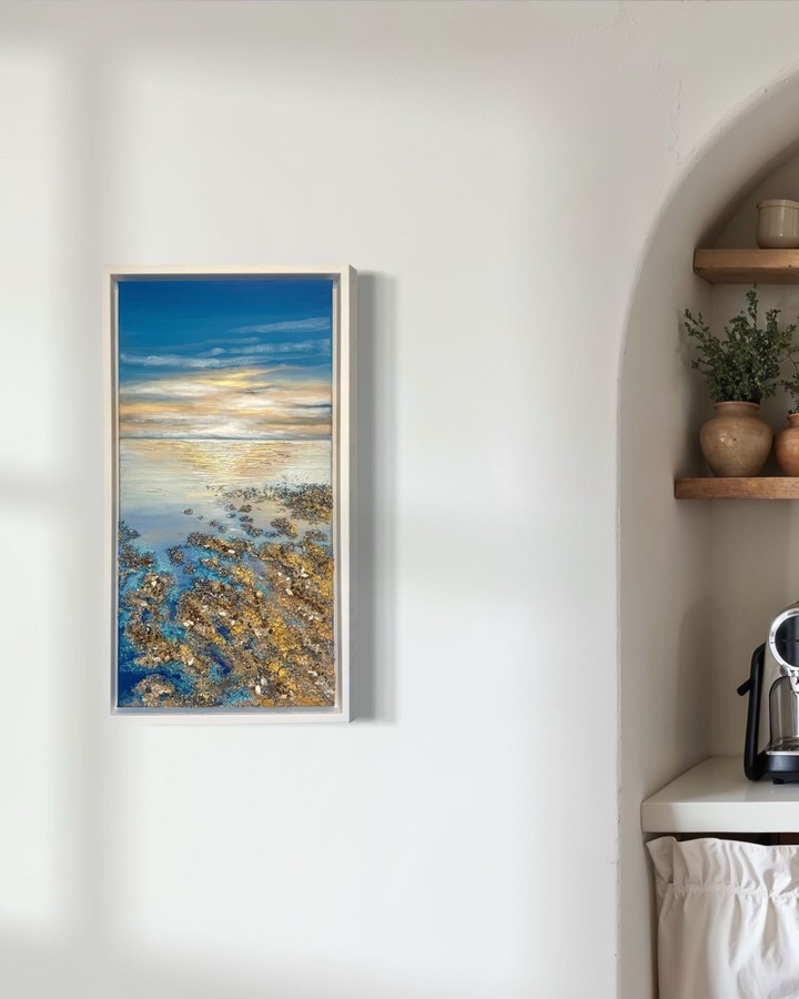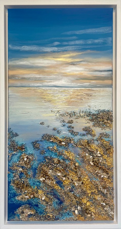 Golden light shimmers across the water, capturing the fleeting magic of twilight as the sea glows with warmth and brilliance. Swarovski crystals and gemstones reflect the ocean’s ever-changing beauty, evoking a sense of wonder and serenity. But beneath its radiance lies a fragile and mysterious world—one that must be cherished and protected.