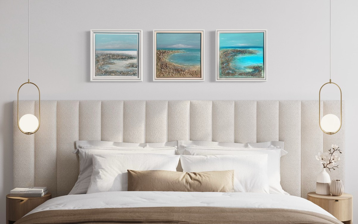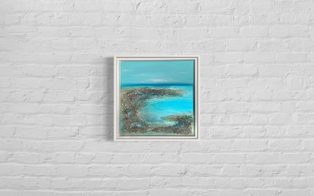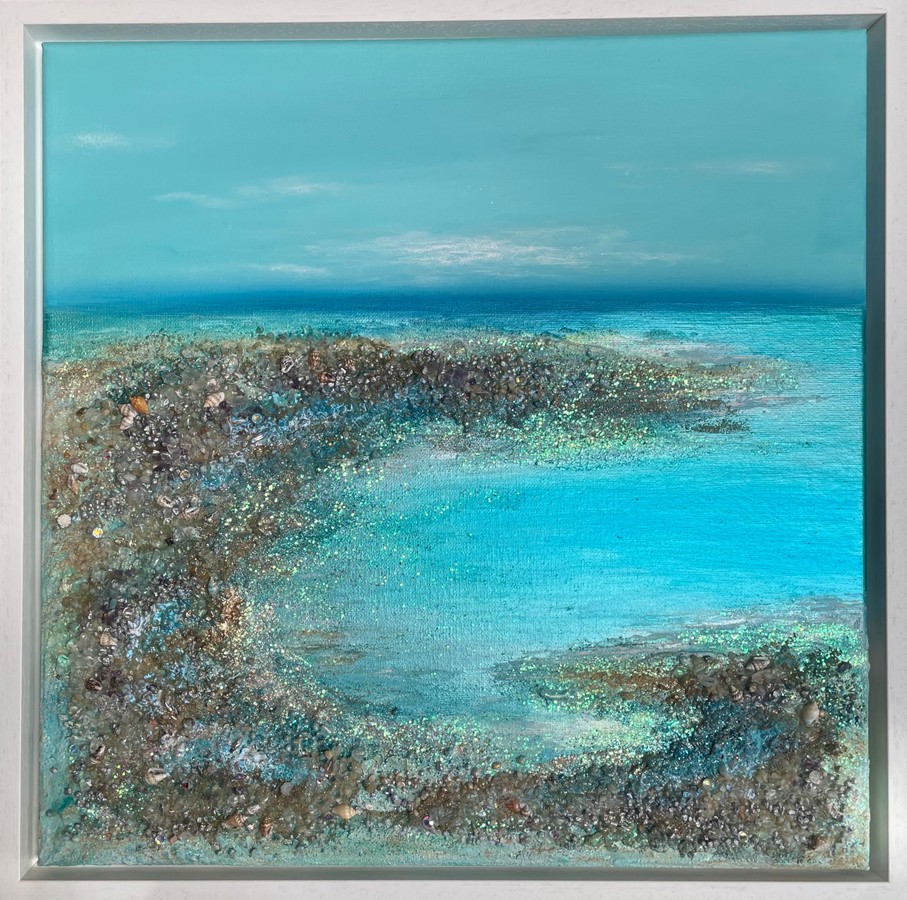 A tranquil coastal scene with twinkling textures. The soothing aqua tones evoke a sense of vibrant calmness, reminiscent of a peaceful day by the shore. Real amethyst gemstones, clear crystal quartz, and Swarovski crystals add a therapeutic touch, infusing the artwork with healing energies. The shining seas gently recede, revealing glittering rock pools, the crystals glint, inviting viewers to immerse themselves in the beauty of this coastal jewel.