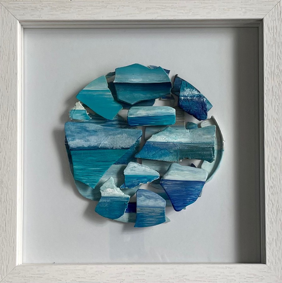 Every day, I stroll along the beaches of East Sussex with my faithful canine companion (Geoffrey, the Welsh Terrier). During low tides, especially after stormy nights or during spring tides following the full and new moons, the shoreline reveals its treasures. Among the seaweed and shells lie remnants of marine life like mermaid's purses, cuttlebones, and whelk egg cases. Sadly, alongside these natural wonders, I encounter a plethora of discarded fishing nets and plastic fragments, some of which have journeyed vast distances. Faced with this overwhelming sight, I saw an opportunity to repurpose these fragments into canvases for my art, painting seas on what would otherwise be waste. My aim is to portray 'seas of plastic,' a sobering reminder of the potential fate of our oceans if we fail to change our ways. Through transforming litter into painterly sea vignettes, I strive to evoke both hope and urgency in the call to protect and preserve our oceans. This process symbolizes our collective choice to love and safeguard these vital ecosystems, showcasing the power of transformation even in the face of environmental challenges.