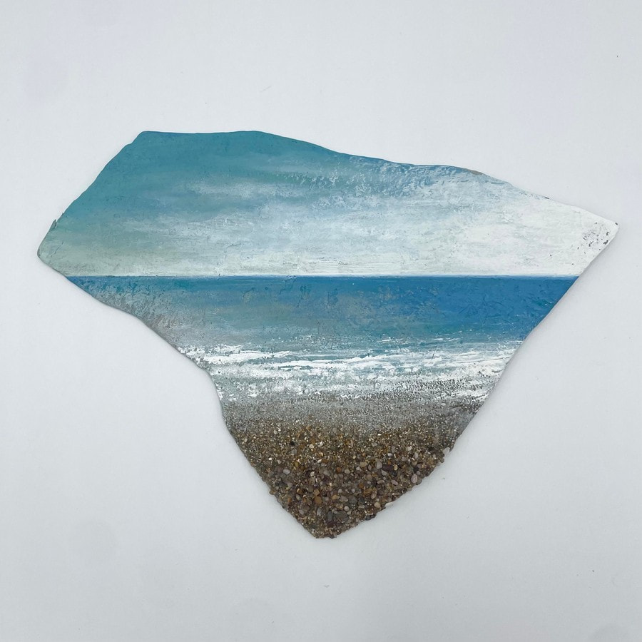My daily dog walks on the East Sussex beaches often reveal shoreline treasures, especially at low tide after storms or spring tides. Amongst the seaweeds and shells, I find discarded fishing nets and plastic fragments, sometimes from faraway places. Seeing the overwhelming plastic pollution, I decided to repurpose these materials into my art, creating 'Plastic Seas' to reflect the potential future of our oceans if we don't change our behaviours. 60-90% of marine litter is made of plastic items which could take hundreds of years to break up. My goal is to turn these marine plastics into painted sea vignettes, blending beauty with a powerful message of hope and urgency. Through this process, I aim to inspire love and protection for our oceans, showcasing the potential for positive transformation despite environmental challenges.