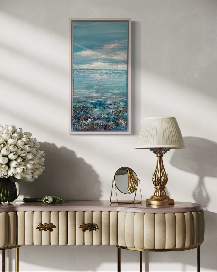 Sunlight catches the surface of still water, illuminating the delicate world within. ‘Rockpool Waters’ captures the quiet clarity of midday by the shore—where the tide has retreated, leaving behind shimmering pools that reflect the sky.