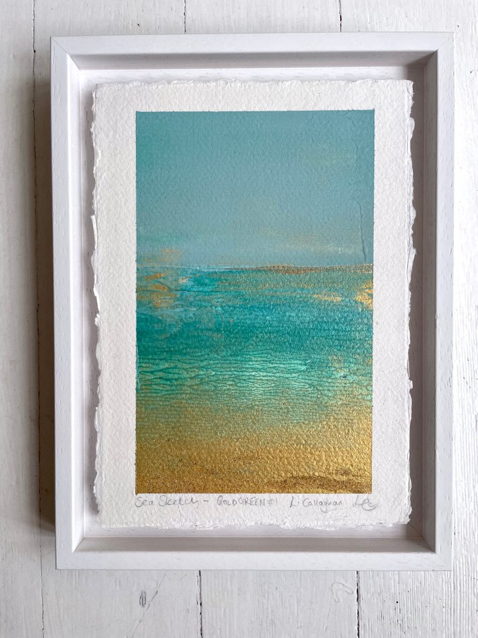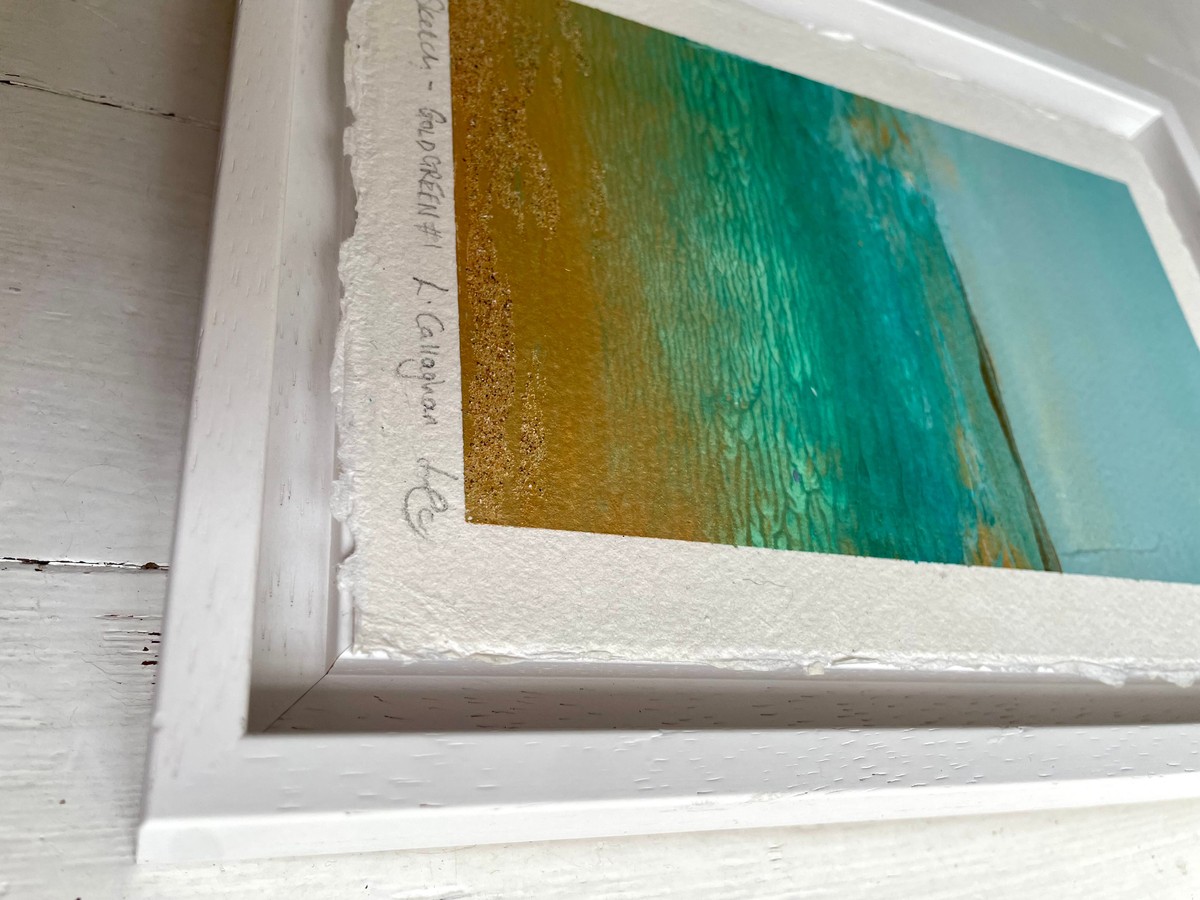 The Sea Sketch - Gold Green series - is an homage to the splendour of the natural world, beckoning onlookers to revel in the sun's radiant warmth and delight in the invigorating sea breeze caressing their skin. The khadi paper complements the beach-centric motif by accentuating the artwork's innate and organic essence.