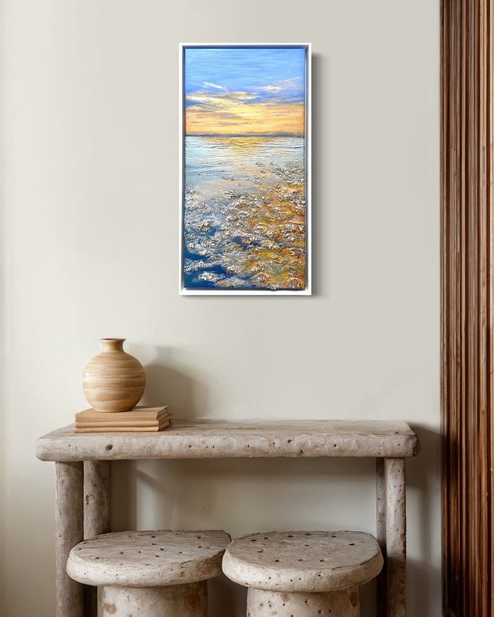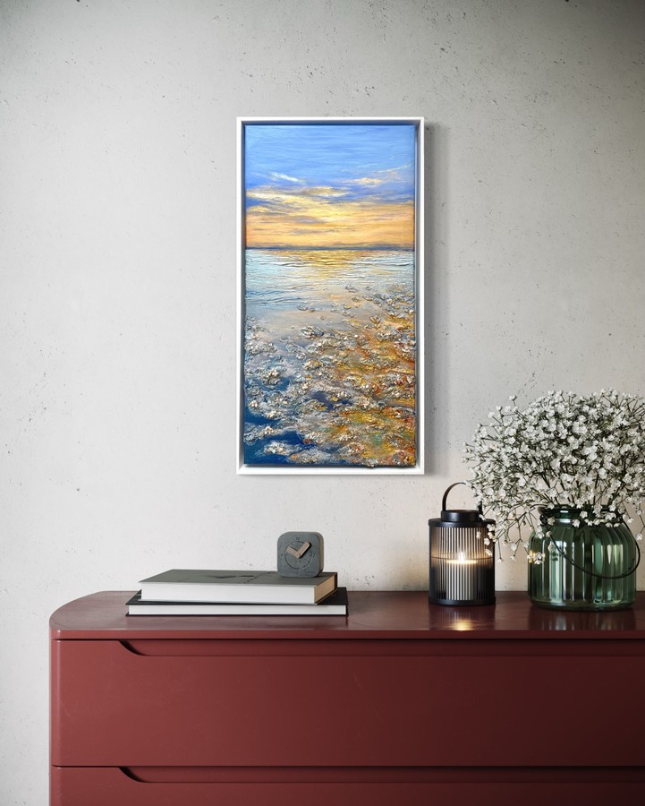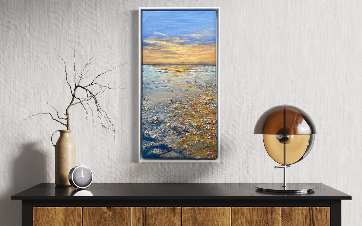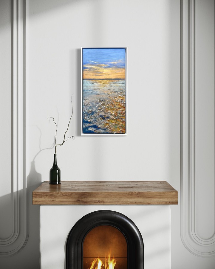 The serene sunset at my local beach in Saltdean, the sun casting a warm glow over the horizon, bathing the scene in rich oranges and glowing golds. The rock pools are enriched with freshwater pearls and citrine gemstones. Watching the sunset over the sea fills me with a profound sense of peace and reflection: it offers a rare moment of quiet contemplation. It's a time when the day's hustle fades away, replaced by the soothing sounds of the waves and the golden light that seems to hold all the day's promises and dreams.