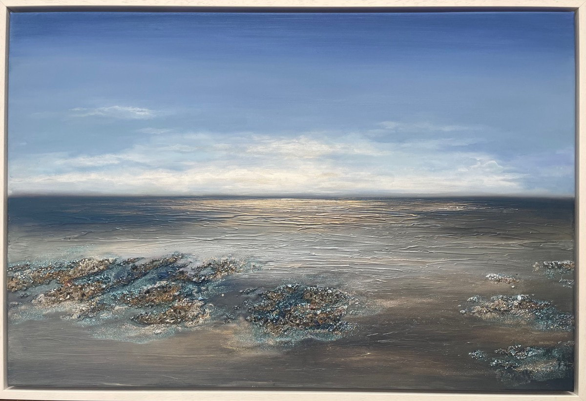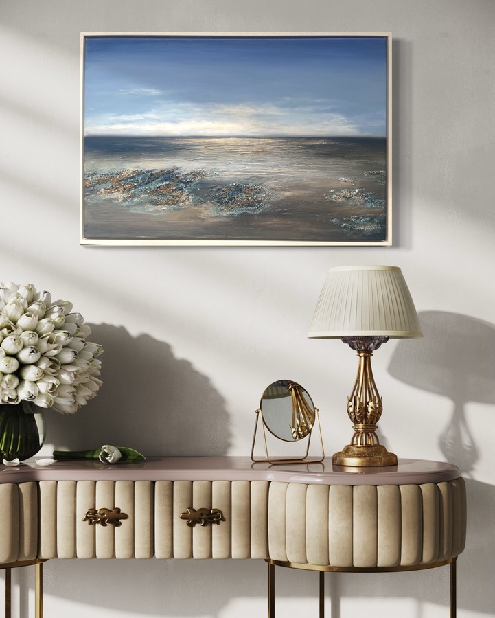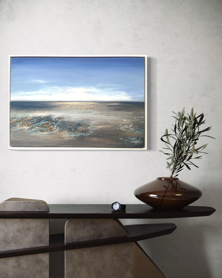 This painting is a visual ode to the healing power of the ocean. Standing by the water's edge, you feel a deep sense of connection to the rhythms of life, as the ebb and flow of the tides mirror the natural cycles and balance of our existence. The sea's constant motion reminds us to breathe, to let go, and to find peace in the present moment. Spending time by the sea is an act of self-care, a way to recharge and find inner peace.