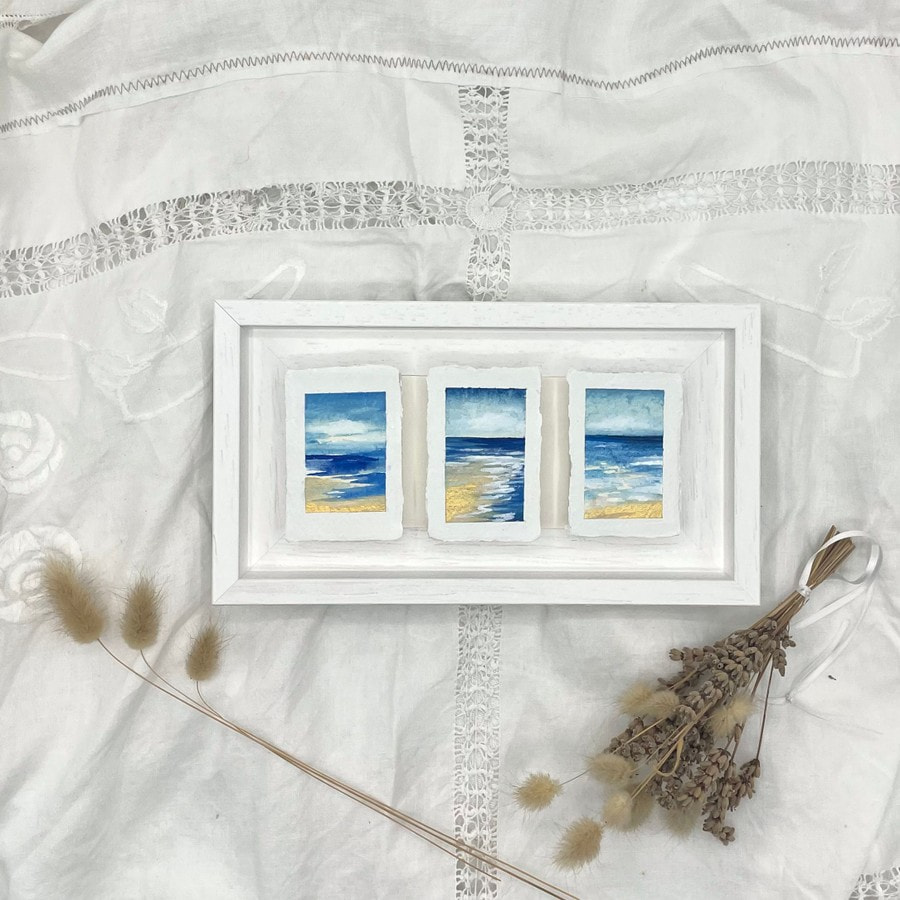 Housed as a triptych in an open floating frame, and hand signed by the artist. On A8 sized Khadi rag paper with deckled edges.