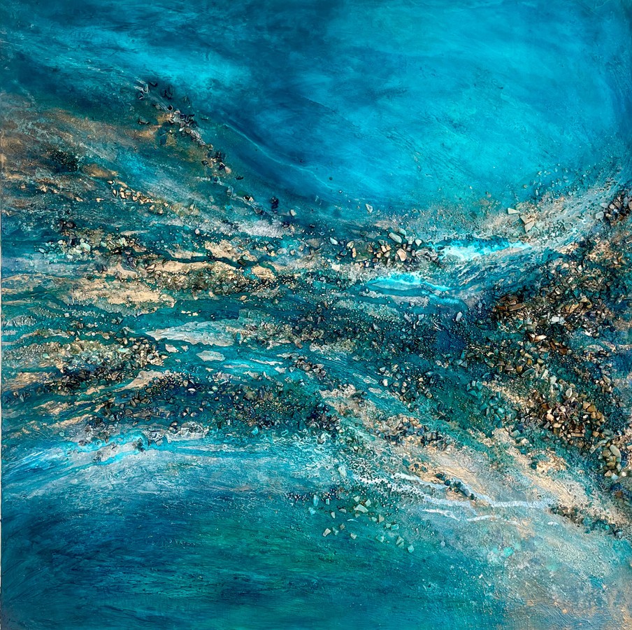 ‘Water’s Littoral’ is a response to the photography. It invites the viewer to witness the force and strength of our life-sustaining waters in spite of man-made abuses. Mother Earth fighting her good fight against the odds and in spite of her ongoing abuse. Water, sea and ocean as a metaphor for majestic feminine power, with sea water from local shores used as an elemental and fundamental connection to our life-giving waters. It is a protest against ecological destruction, by embracing the ecofeminist energy of Mother Nature’s spirit, recognising nature as having agency and resilience.